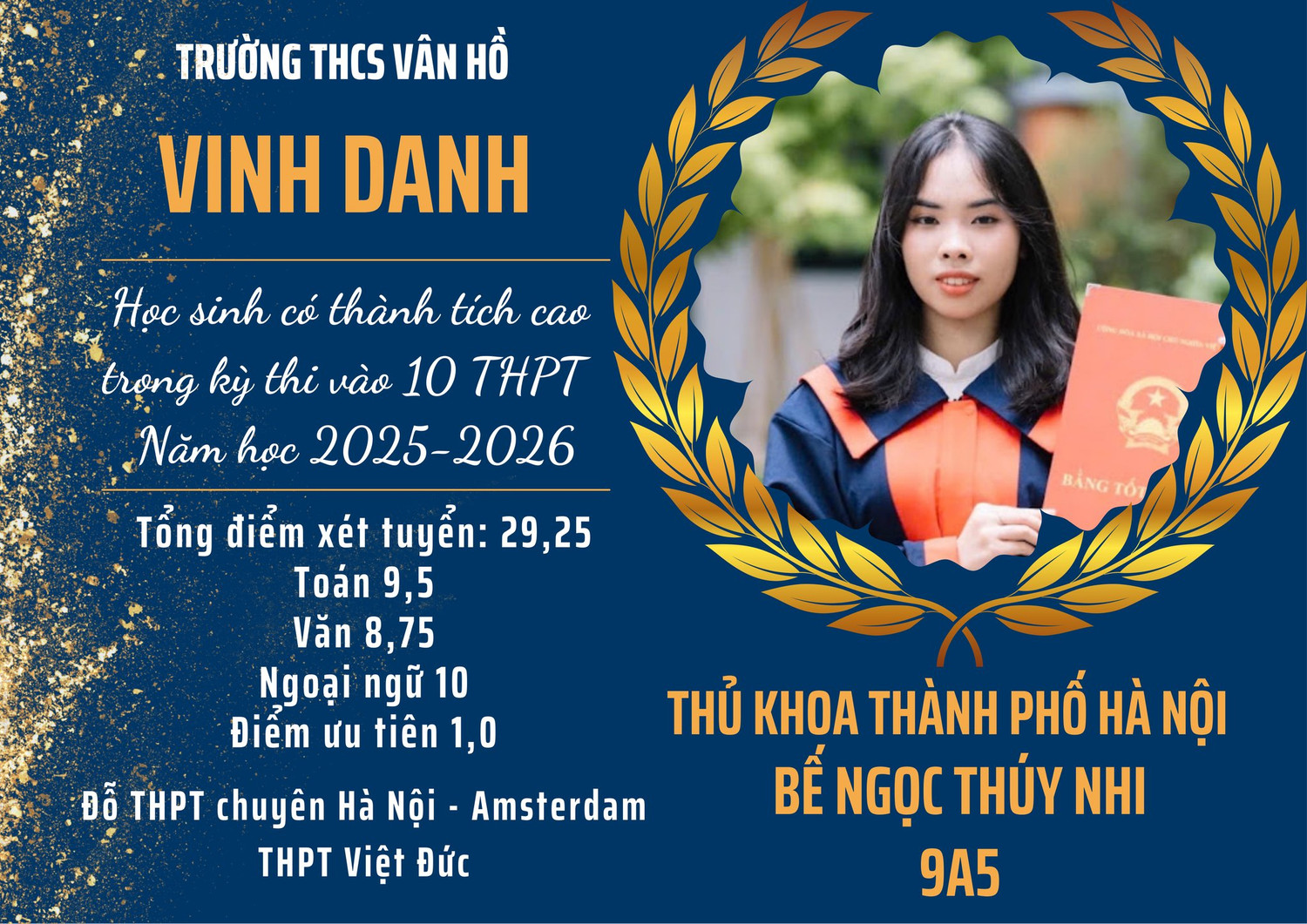 học sinh lớp 9A5 đã trở thành thủ khoa khối không chuyên với 29,25 điểm.